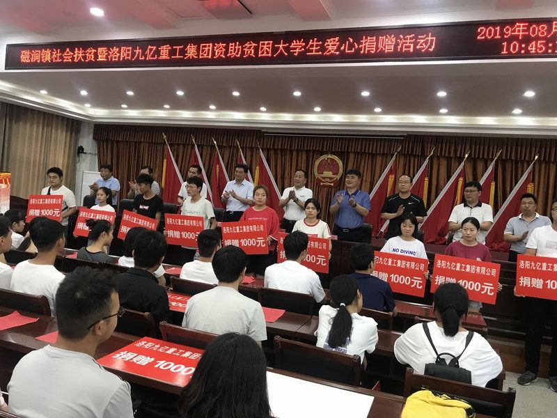 愛是與生俱來的,在血液里流動,在骨子里結晶,它源源不斷的由心而生,永不枯竭,只要人人都愿意奉獻一點愛,就如甘霖沐浴大地,人間處處盛開幸福之花! 為響應洛陽市政府精準扶貧政策,洛陽九億重工集團有限公司及董事長王九茂積極參與捐資助學的慈善義舉活動,特做出如下決定:1、公司幫扶磁澗鎮(zhèn)2017年新招貧困大學生21名順利入學,每人資助2000元,總計肆萬貳仟元整; 2、總經理王九茂(縣政協委員)以個人名義資助磁澗鎮(zhèn)南窯村2017年新招大學生6名,總計12000元整; 我相信,在社會各界的大力支持和共同努力下,我們的“愛心助學”活動將會惠及到更多的同學,為了夢想,刻苦讀書、報銷祖國,廣大同學也一定會在溫暖的社會大家庭里茁壯成長,必將成為國家建設的有用之才! 洛陽九億重工集團有限公司 董事長:王九茂